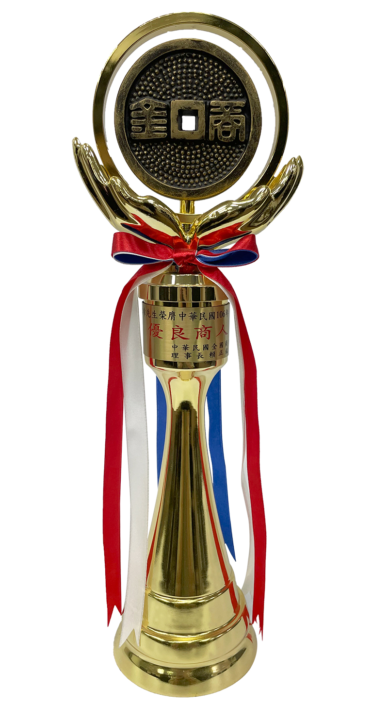[ゴールデンマーチャント賞] は中華民国で最も古い全国レベルの企業賞の 1 つです。外国投資を奨励するため に、この賞は政府から高く評価されています。毎年大統領から受け取り、経済省と外務省の担当人からも授与され ます。中華民国のグッドマーチャント賞は、企業の優れた証明を表しています。それはまた、会社のイメージを授け る最高の肯定と名誉であり、台湾の強さも担っています。この賞を受賞することで、将来台湾にかなりの力と影響力 を持つことを確信できます!